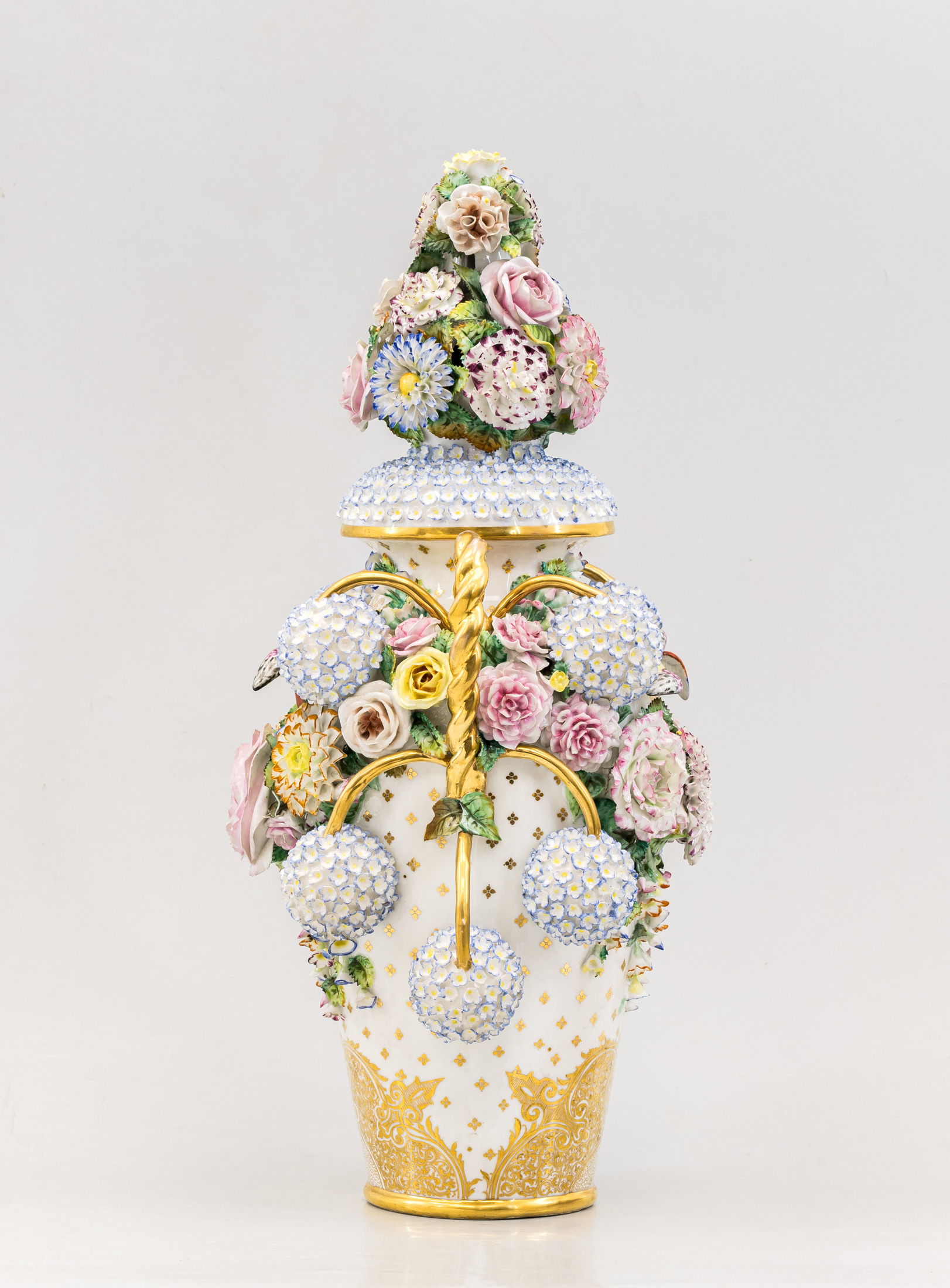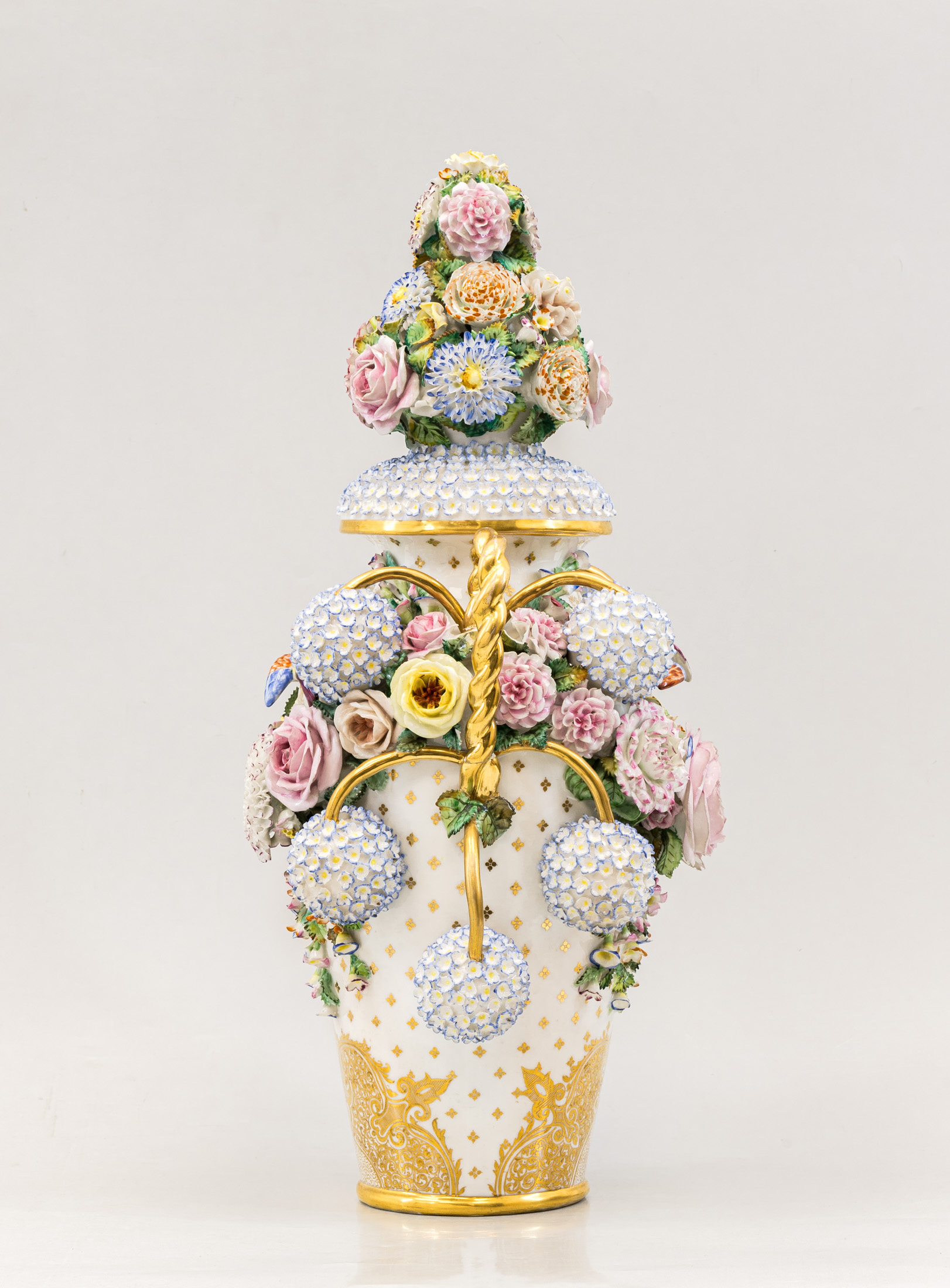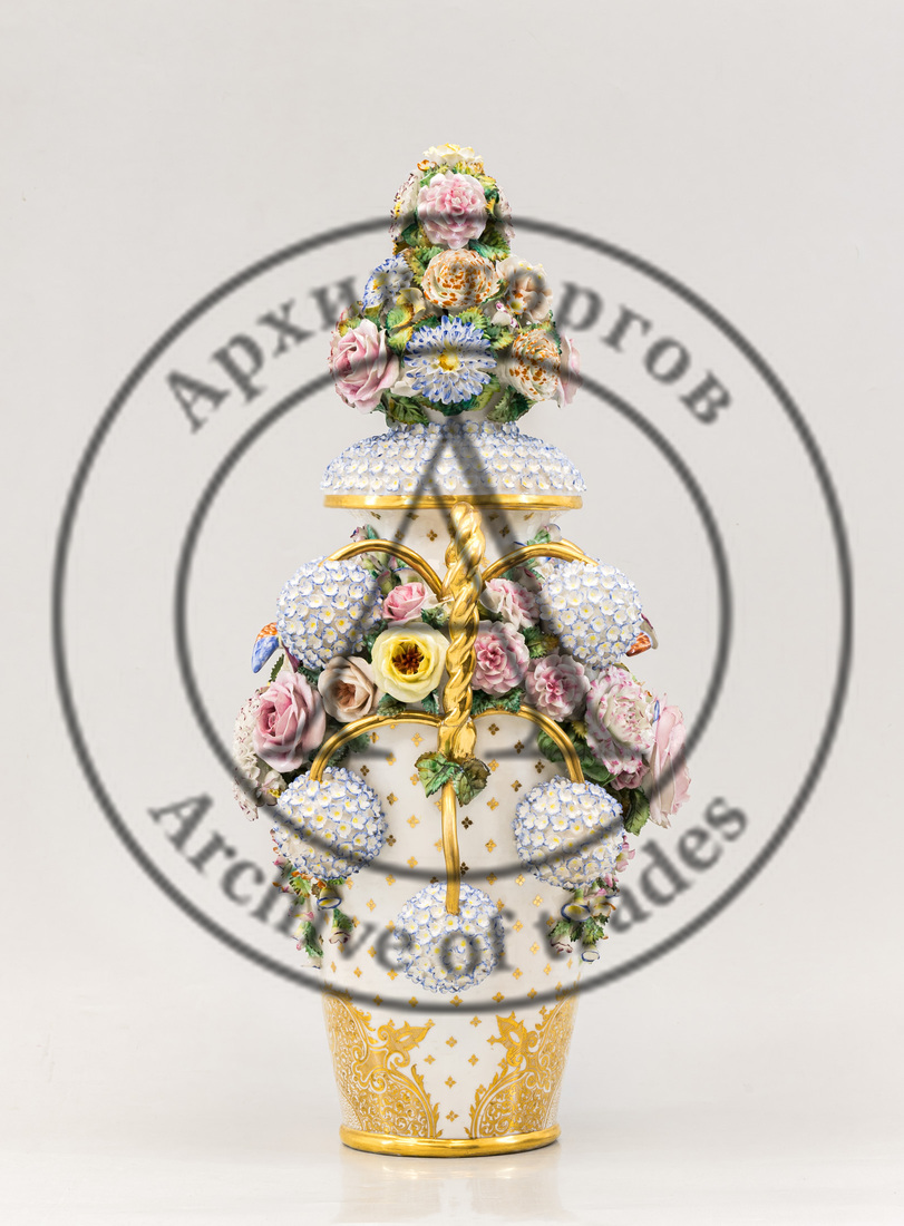 Фарфор, лепка, полихромная надглазурная роспись, золочение.