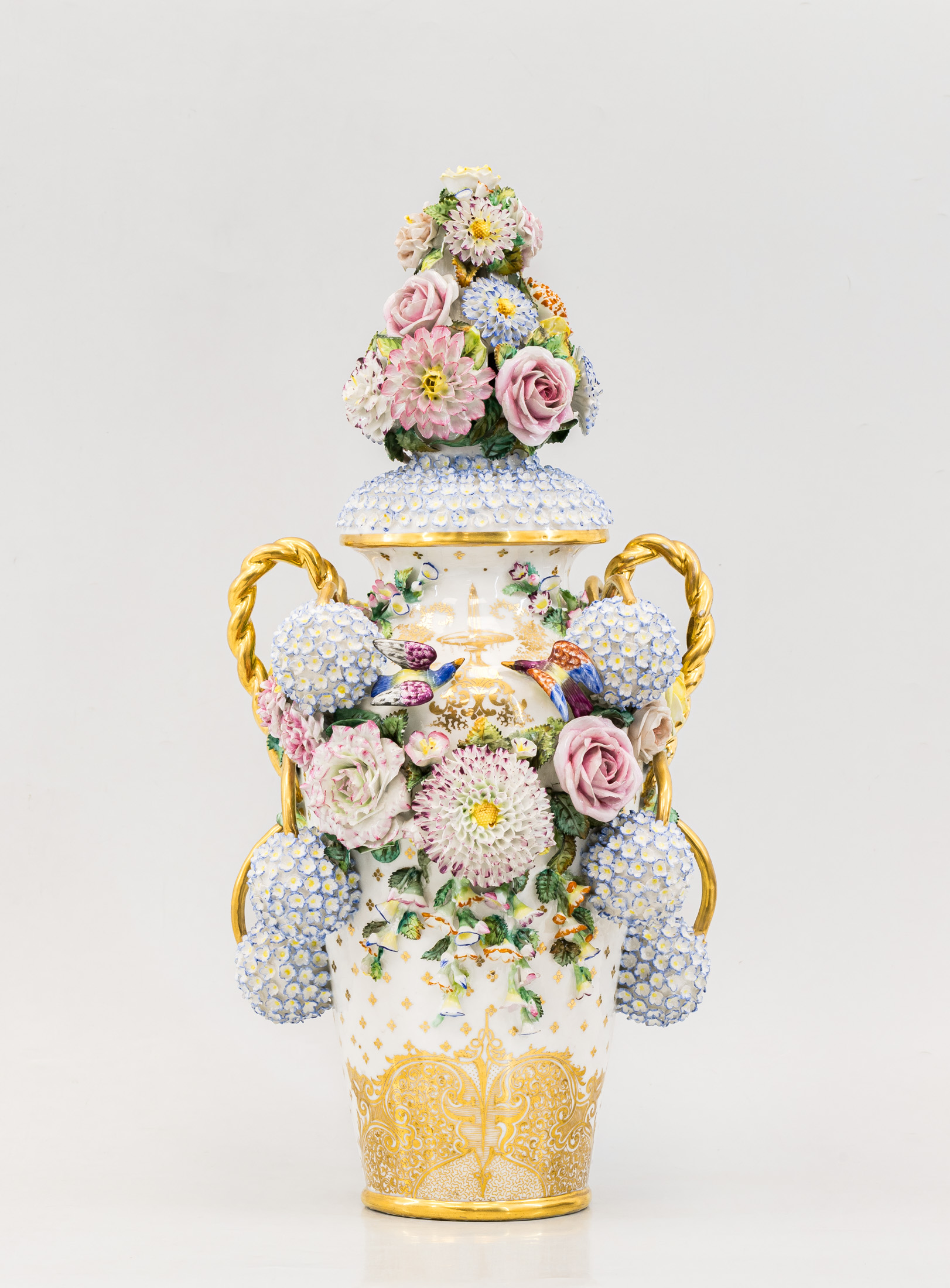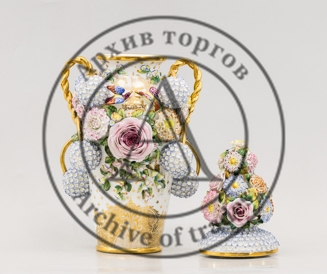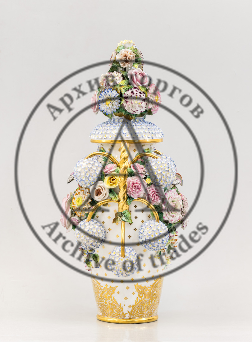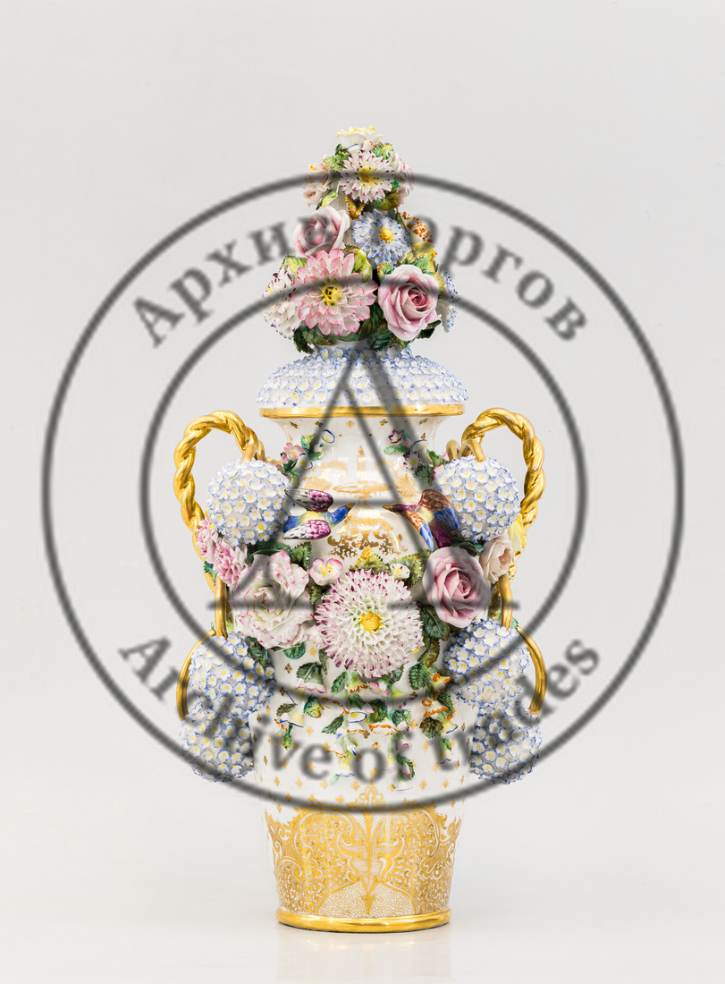 Ваза с крышкой, декорированная цветами и фигурами птиц
