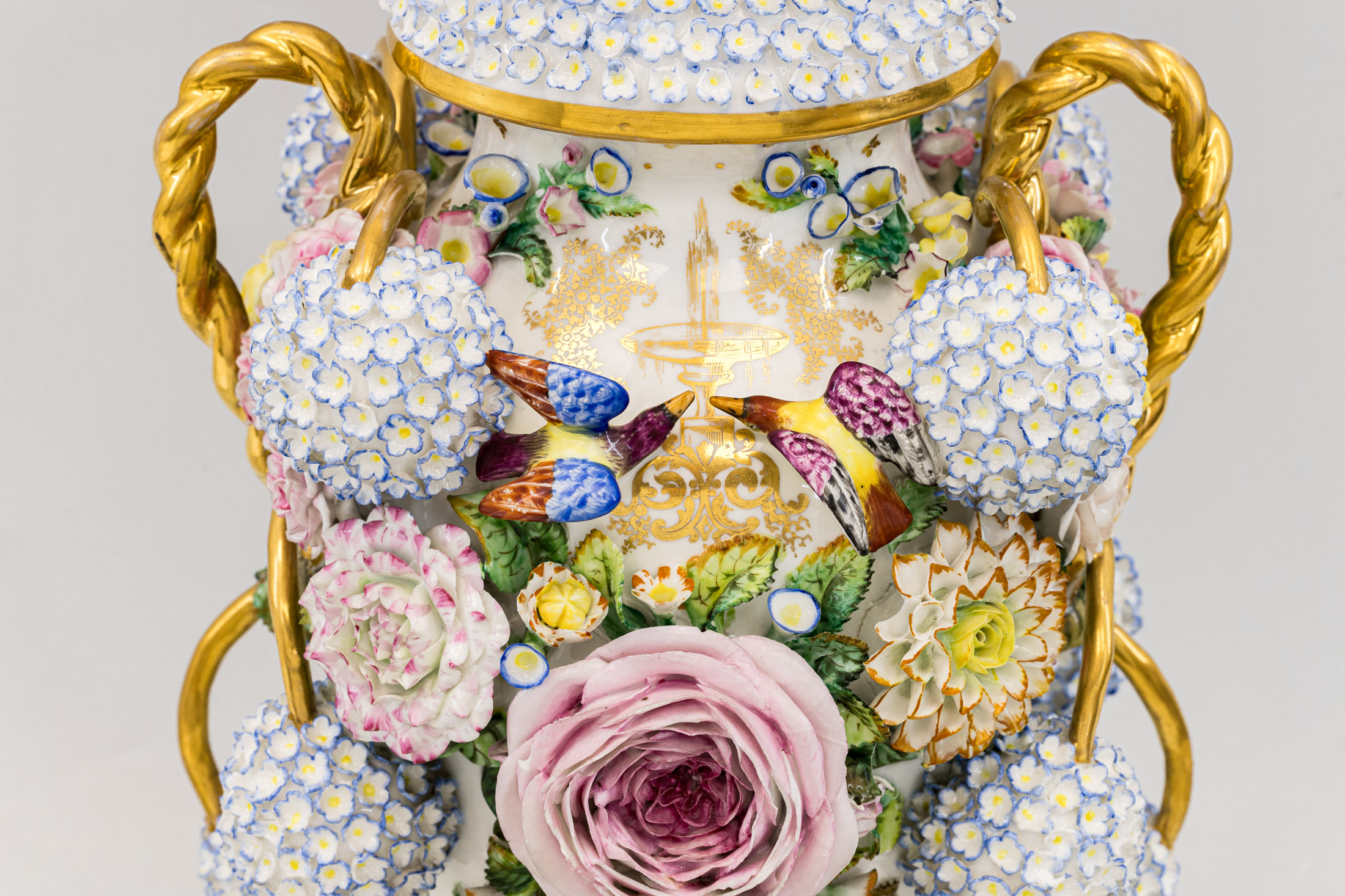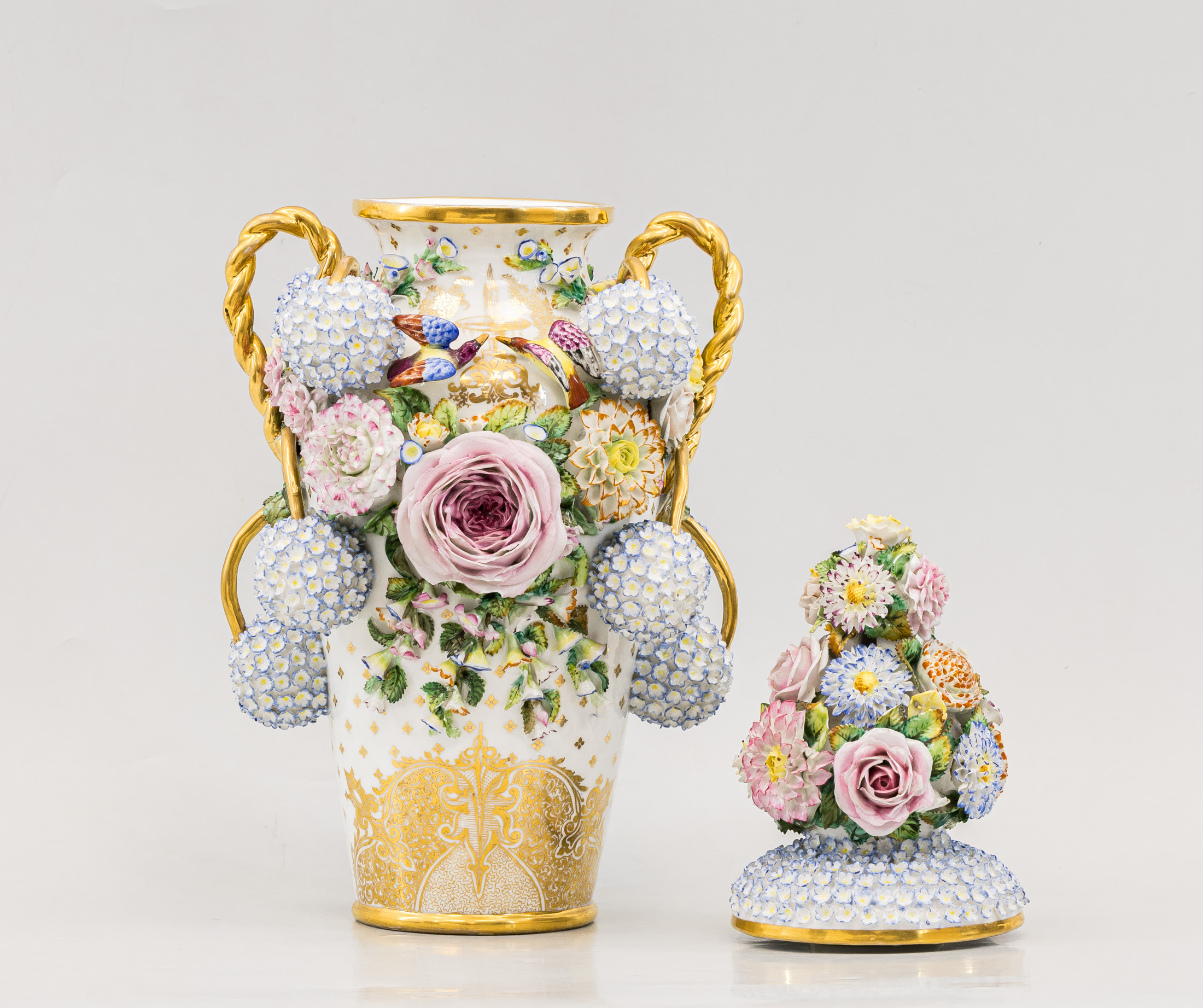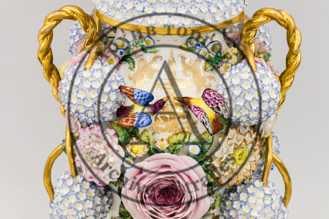 Ваза с крышкой, декорированная цветами и фигурами птиц