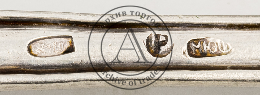 клейма перепробации советского периода: 3) «голова рабочего, повернутая вправо, с молотком, под ним литера «Δ» («дельта») и обозначение пробы «800» в щитке в виде усеченного овала (обозначение заграничного изделия при клеймлении на таможне с указанием пробы, 1927–1954 гг.); 4) МЮФ» в овальном щитке (Московская ювелирная фабрика); 5) «Р» в круглом щитке.