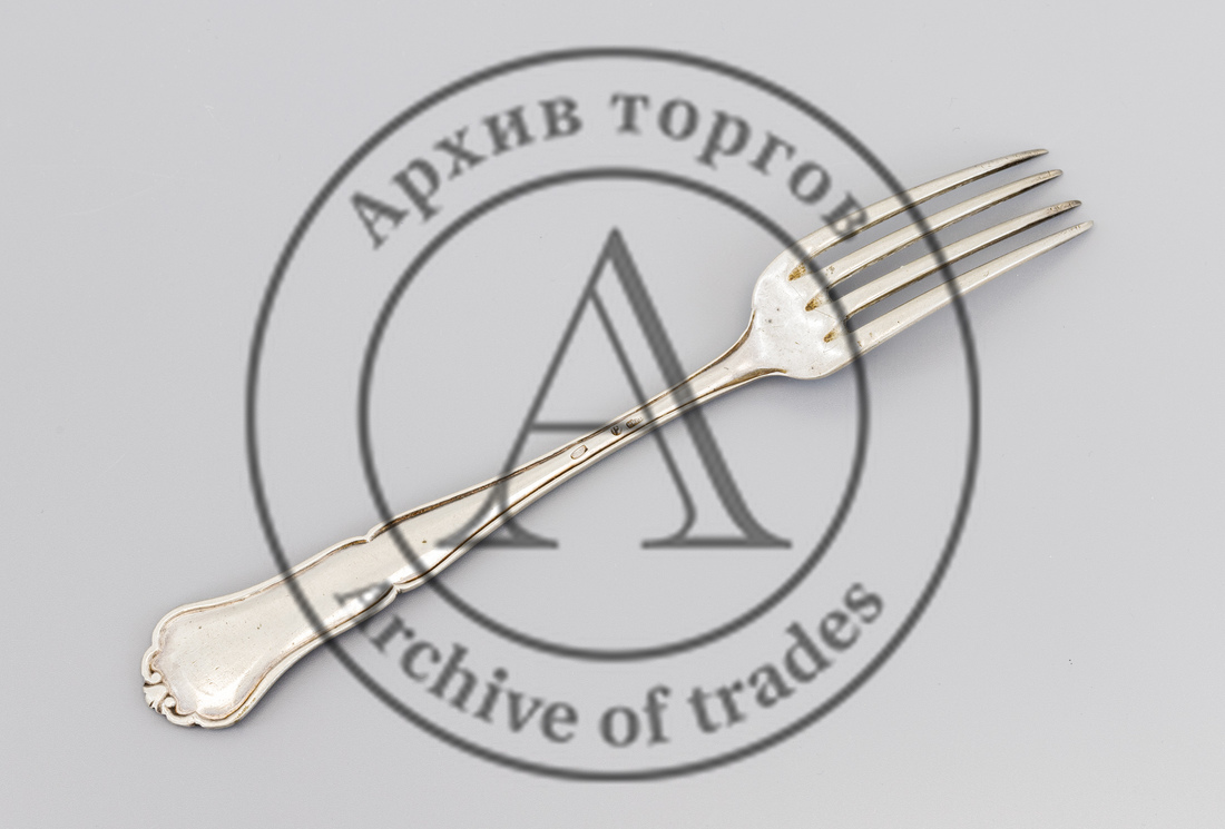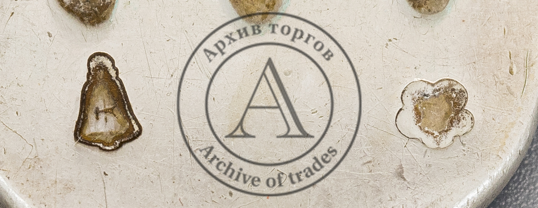 Клеймо: 1) «голова Дианы, обращенная вправо» в щитке в виде пятилистника с цифрой «3» и литерой «P» (обозначение 800-й пробы и города изготовления в период 1872–1922 гг.); 2) в фигурном щитке цифра «3», «морда собаки, обращенная вправо» и литера «P» (Будапешт) (?) (нечитаемое клеймо);