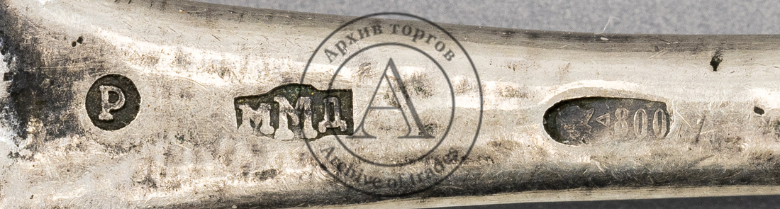 клейма перепробации советского периода 2) «голова рабочего, повернутая вправо, с молотком, под ним литера «Δ» («дельта») и обозначение пробы «800» в щитке в виде усеченного овала (обозначение заграничного изделия при клеймлении на таможне с указанием пробы, 1927–1954 гг.); 3) «ММД» в фигурном щитке; 4) «Р» в круглом щитке.