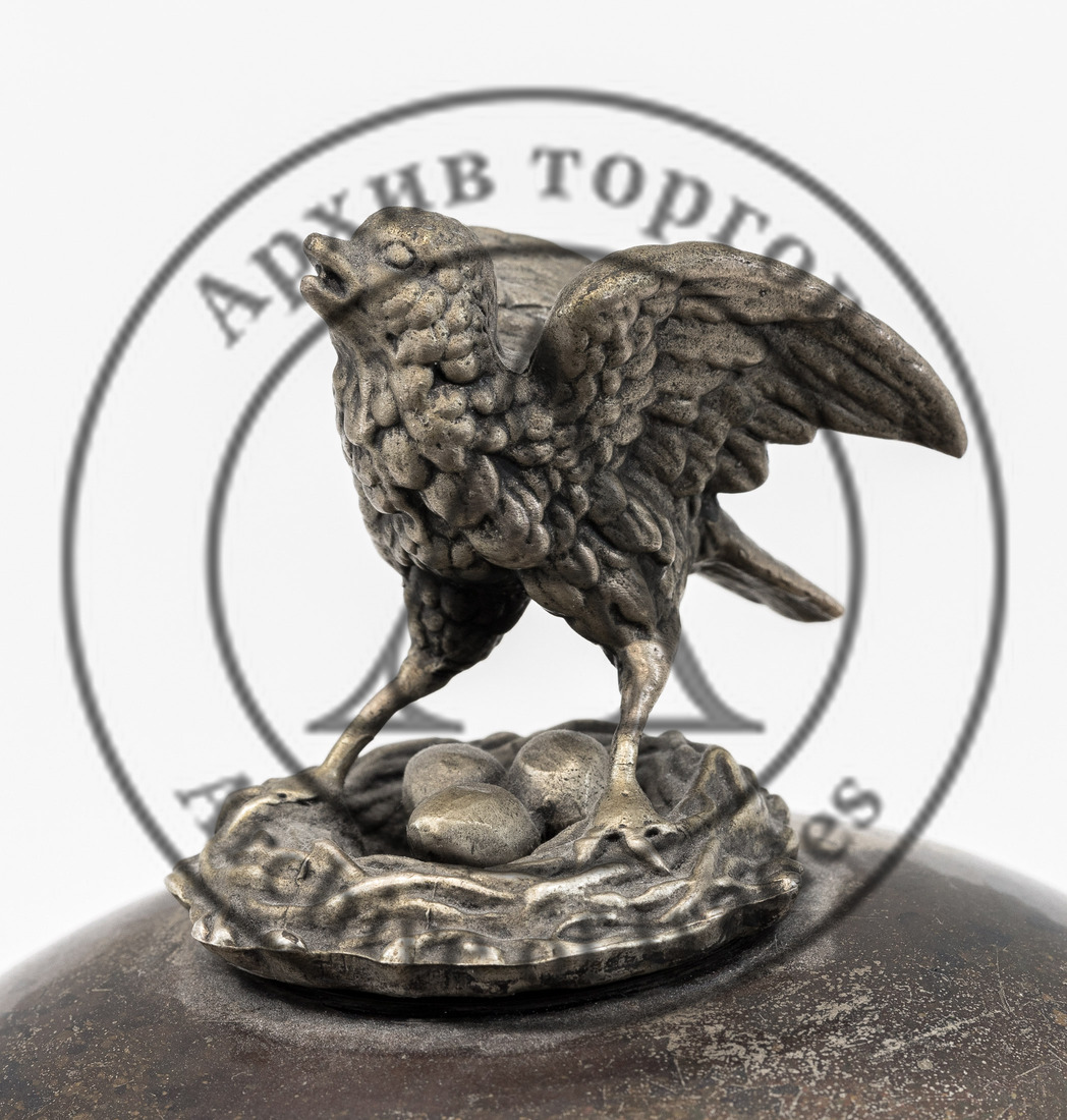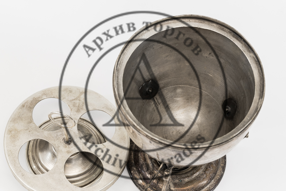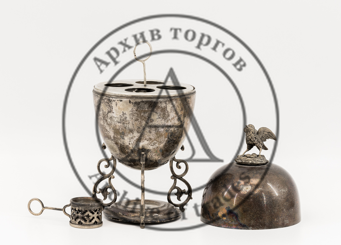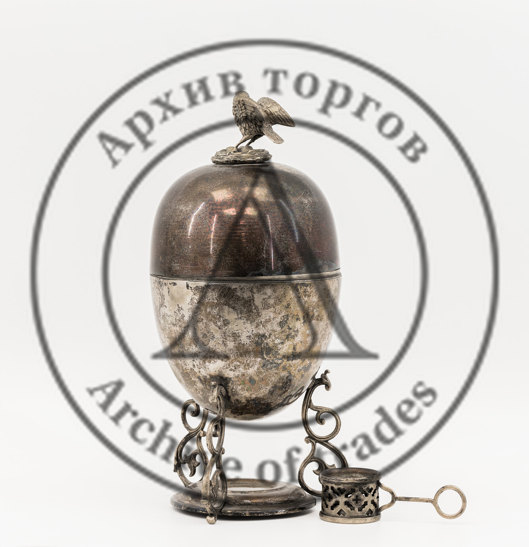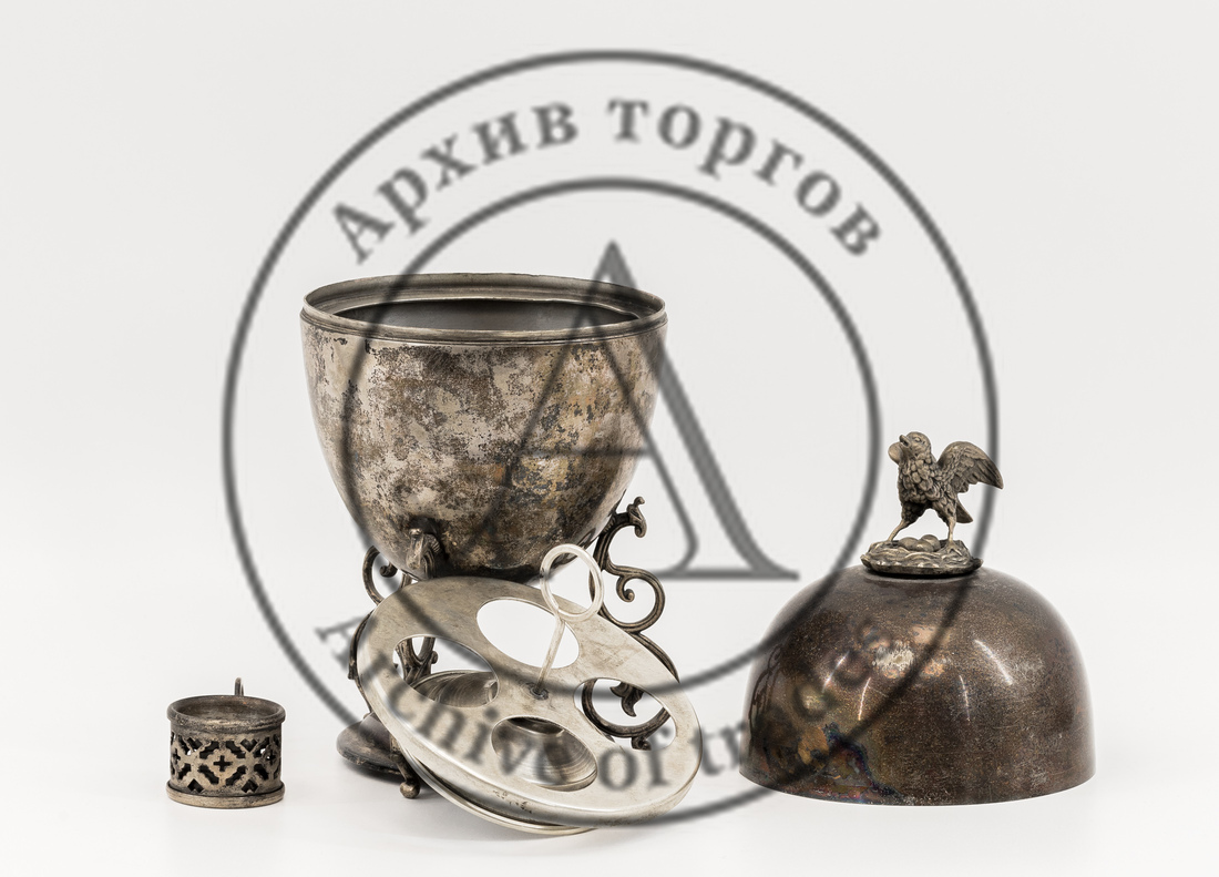 Состоит из четырёх частей: 1) основная часть в виде гладкого тулова на трёх изогнутых ножках с подставкой; 2) куполообразная крышка, увенчанная ручкой в виде фигуры птицы у гнезда; 3) съёмная подставка для четырёх яиц с ручкой с кольцевым захватом; 4) подставка для свечи или спиртовки с ручкой с кольцевым захватом.