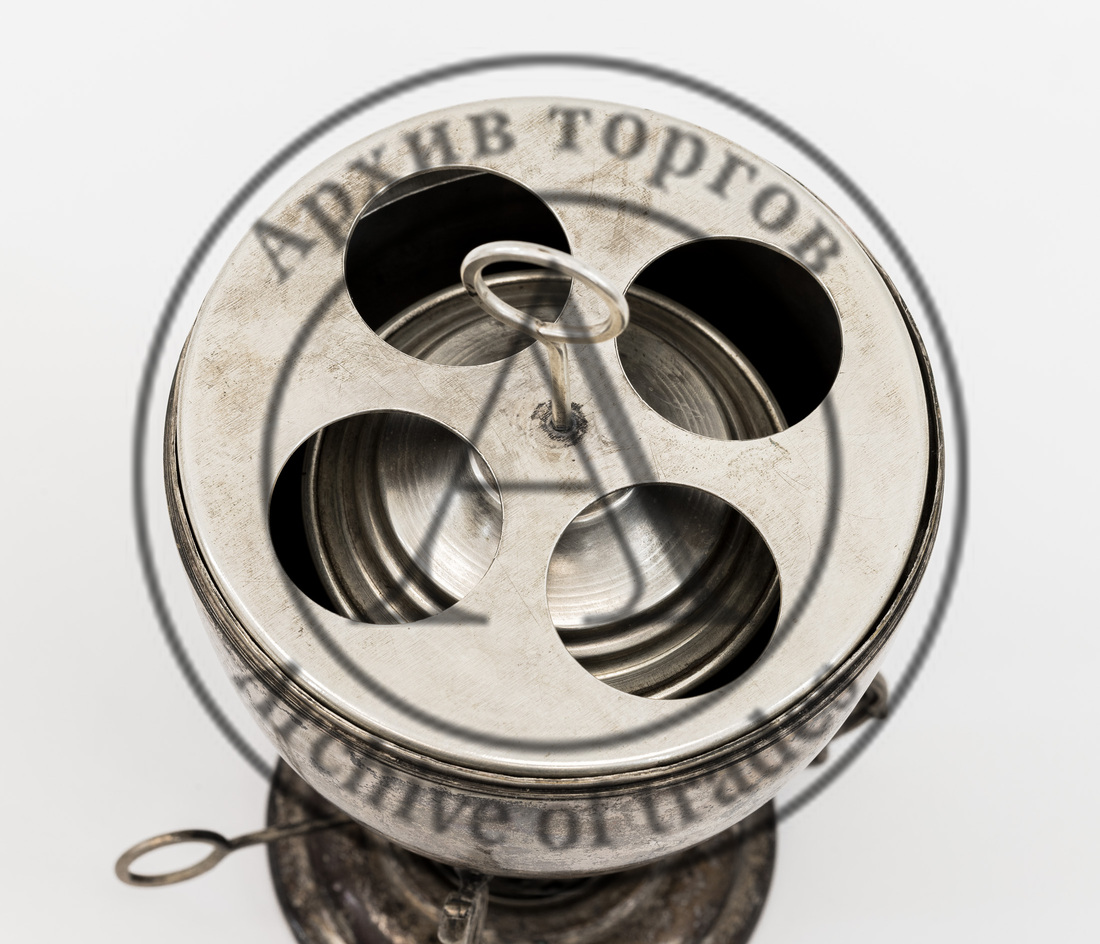 Сохранность: царапинки, патина, легкая деформация основной части, следы пайки внутри и на исподе дна подставки.